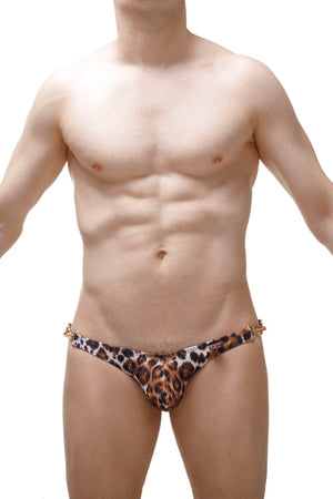 Badebikini mit superniedriger Taille und goldenem Clip an den Seiten. Leopardenmuster für eine wilde Seite.