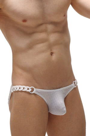 Weißer Low-Rise-Minibikini mit Seitenketten. Leicht durchbrochenes Material.