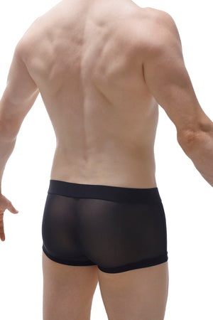 Transparente schwarze Boxershorts mit Ausschnitt am Schambein. Abnehmbarer Penisring aus schwarzem Silikon. Neuer elastischer PetitQ-Gürtel