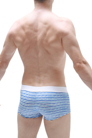 Blau-weiß gestreifte Shorts mit niedriger Taille, kurz an den Oberschenkeln, mit großer Vordertasche und nahtlos, um maximalen Komfort zu gewährleisten.