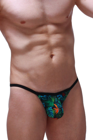 Dieser Stringtanga besticht durch seinen weichen Nylon-Vorderteil mit einem auffälligen Tropenmuster . Die Rückseite ist minimalistisch im T-Back -Stil gestaltet. Er bietet minimale Bedeckung am Po und gleichzeitig eine einzigartige, farbenfrohe Form vorne.