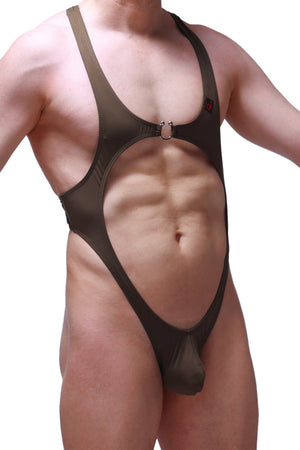 This thong bodysuit is made from dark olive green nylon , a fabric that is both soft and stretchy.