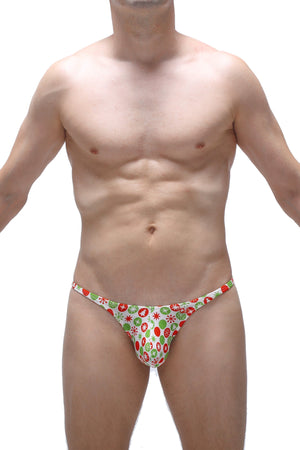 White thong with Christmas print, pretty front pocket, thin sides. Very stretchy modal.