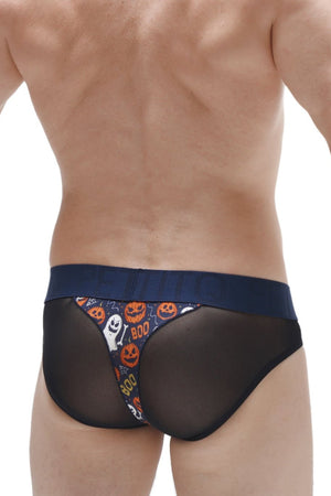 Slip sexy transparent en maille noire avec la forme du string à l'arrière et la poche. Imprimé fun pour Halloween.